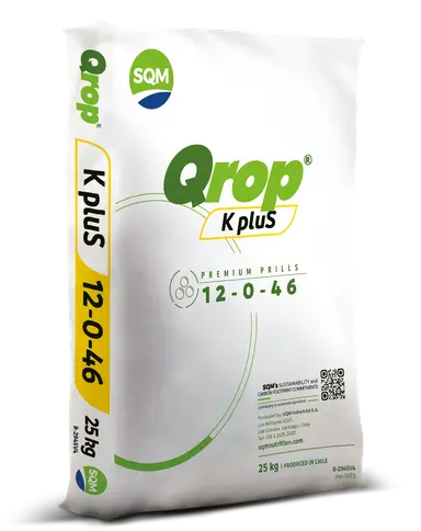 Qrop® K pluS to granulowana saletra potasowa produkowana przez SQM w Chile z saletry w 100% rozpuszczalnej w wodzie. Łączy najwyższą czystość i pełną dostępność składników z wygodą stosowania posypowego. Dostarcza azot azotanowy i potas w idealnych proporcjach, poprawiając plon, smak i trwałość owoców. To nawóz bezpieczny nawet dla najbardziej wrażliwych upraw, takich jak borówka, truskawka czy ziemniak.