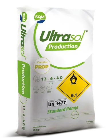 Ultrasol® ProP® Production 13-6-40+TE to nawóz do fertygacji stworzony na fazę owocowania – wysoka zawartość potasu zwiększa plon i poprawia smak, barwę oraz trwałość owoców. Dodatek magnezu i mikroelementów wspiera fotosyntezę i chroni rośliny przed niedoborami. Dzięki innowacyjnej formule ProP® fosfor pozostaje w pełni dostępny, co zapewnia lepsze odżywienie i wyższe zbiory.